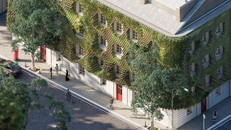 ReFront features modules like planters and moss, creating vertical gardens that enhance urban biodiversity, air quality, and energy efficiency, transforming façades into sustainable living landscapes for a more eco-friendly urban environment.